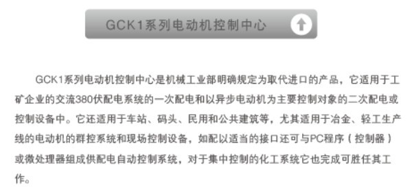 GCKI系列电动控制中心是机械工业部明确规定为取代进口的产品,适用于工矿企业的交流380伏配电系统的一次配电和以导步电动机为主要控制对象的二次配电或控制设备中。它还适用于车站,码头,民用和公共建筑等,尤其适用于治金,轻工生产线的电动机的群控系统和现场控制设备。如配以适当的接口还可与PC程序(控制器)或微处理器组成供配电自动控制系统,对于集中控制的化工系统它也完成可能任其工作。