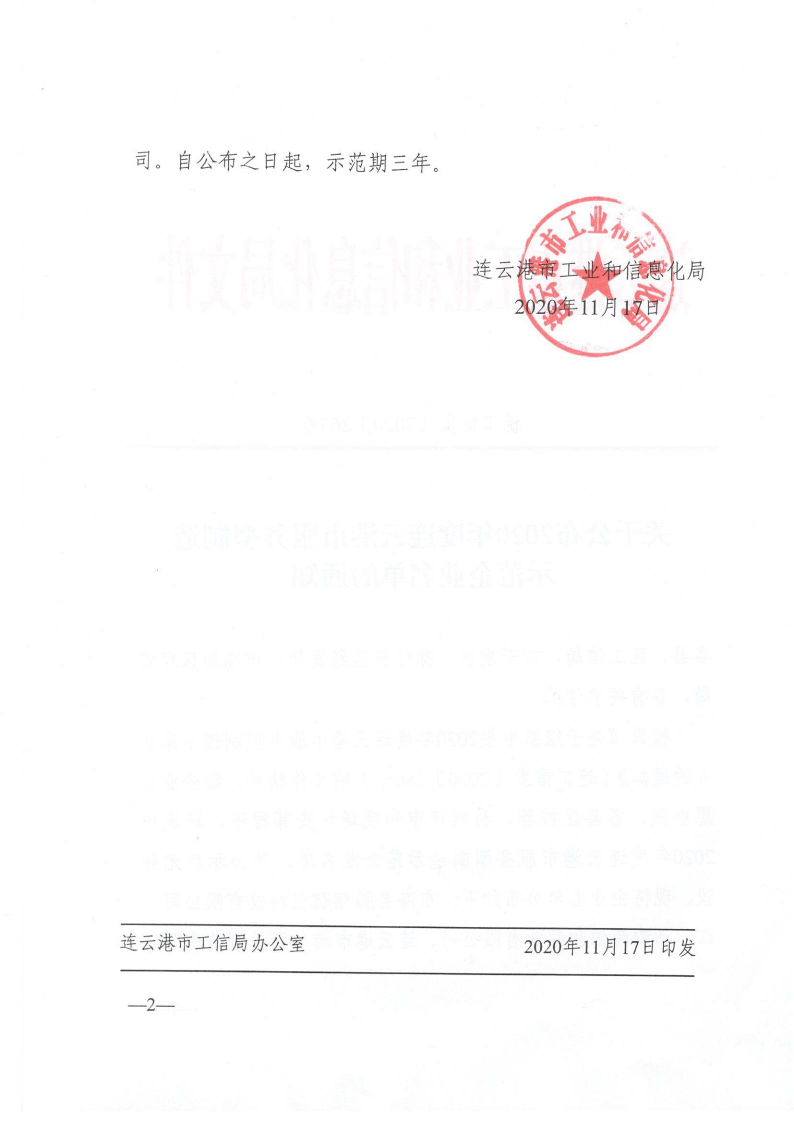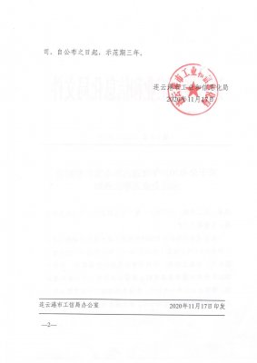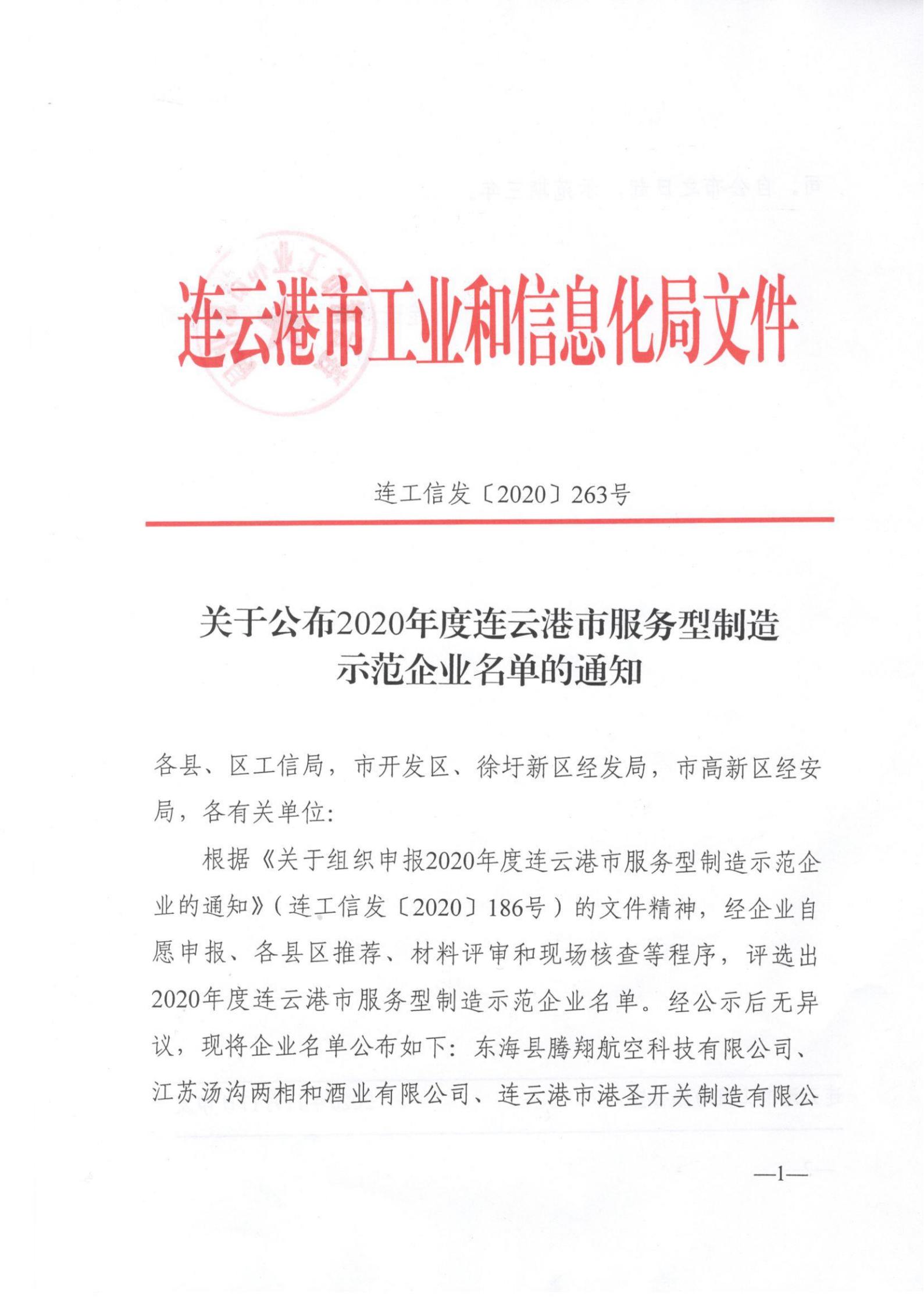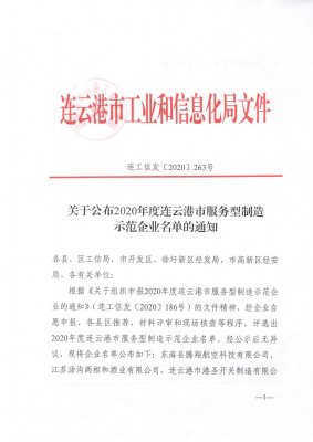 根据《关于组织申报2020年度连云港市服务型制造示范企业的通知》(连工信发〔2020〕186号),经公司自愿申报、海州区推荐、材料评审和现场核查等程序,港圣公司成功入选2020年度连云港市服务型制造示范企业。